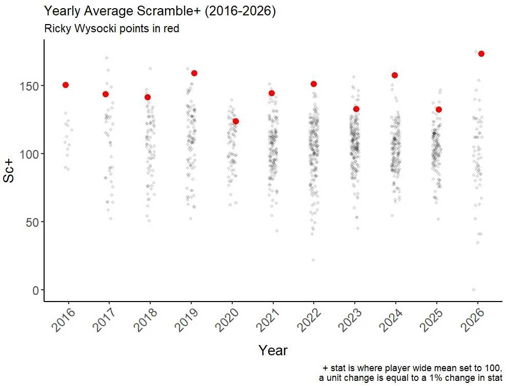 And across the 11 years of data we have, he has THE HIGHEST mean scramble rate (scramble+):